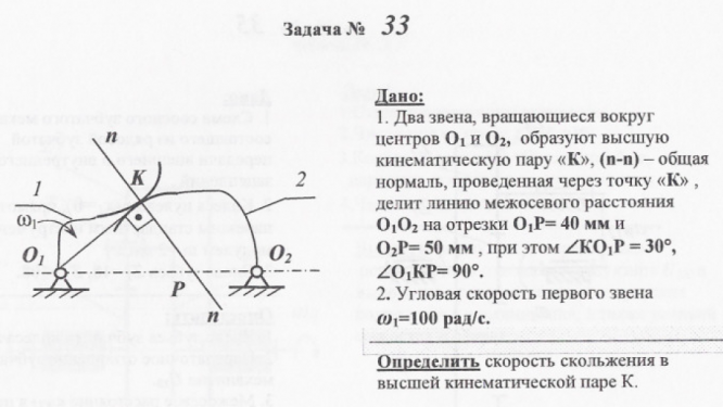 Дано: 1. Два звена, вращающиеся вокруг центров 01 и 02, образуют высшую кинематическую пару «К», (п-п) — общая нормаль, проведенная через точку «К» делит линию межосевого расстояния 0102 на отрезки 01Р= 40 мм и 02Р= 50 мм , при этом Zk01P = 300, Z01kP= 900. 2. Угловая скорость первого звена 01=100 рад/с. Определить скорость скольжения в высшей кинематической паре К..