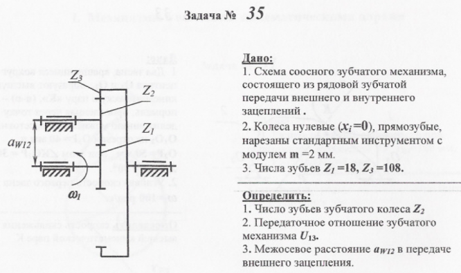 Дано: 1. Схема соосного зубчатого механизма, состоящего из рядовой зубчатой передачи внешнего и внутреннего зщеплений . 2. Колеса нулевые (ХЕО), прямозубые, нарезаны стандартным инструментом с модулем т —2 мм. З. Числа зубьев 741 =18, 7-3=108. Определить: Число зубьев зубчатого колеса Z2 2. Передаточное отношение зубчатого механизма [113. З. Межосевое расстояние щуп в передаче внешнего зацепления..