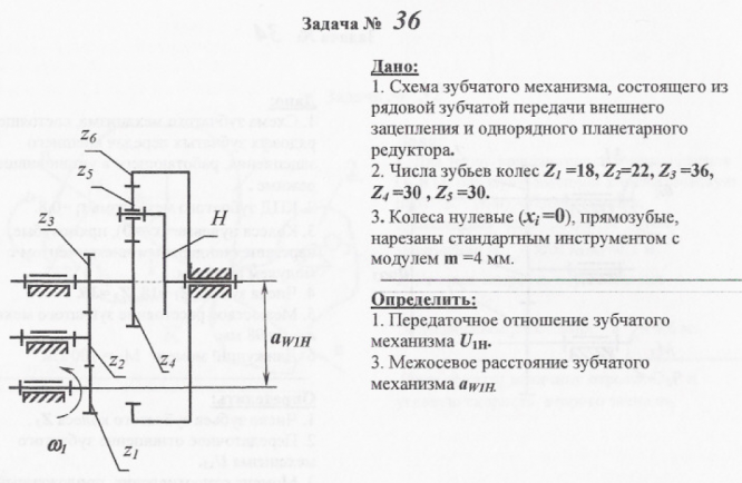 Дано: 1. Схема зубчатого механизма, состоящего из рядовой зубчатой передачи внешнего зацепления и однорядного планетарного редуктора. 2. Числа зубьев колес а =18, а=22, а =36, З. Колеса нулевые (Xi =0), прямозубые, нарезаны стандартным инструментом с модулем т =4 мм. Определить: 1. Передаточное отношение зубчатого механизма UIH. З. Межосевое расстояние зубчатого механизма анчн..