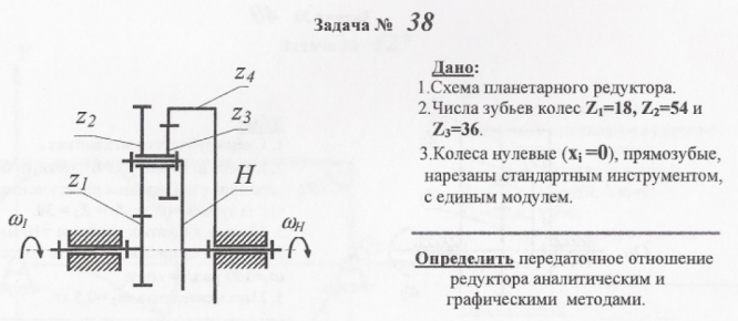 дано: 1 .Схема планетарного редуктора. 2. Числа зубьев колес 7,1=18, и 7+36. 3.Колеса нулевые (Xi =0), прямозубые, нарезаны стандартным инструментом, с единым модулем, Определить передаточное отношение редуктора аналитическим и графическими методами..