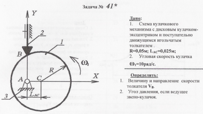 1. 2. Дано: 1. Схема кулачкового механизма с дисковым кулачком- эксцентриком и поступательно движущимся игольчатым толкателем . 2. Угловая скорость кулачка 01=10рад/с. Определить: Величину и направление скорости толкателя VB. Угол давления, если ведущее звено-кулачок..