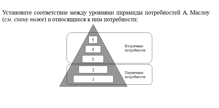 Установите соответствие между уровнями пирамиды потребностей А.Маслоу (см. схему ниже) и относящиеся к ним потребности: