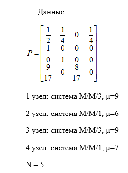 Задана замкнутая сеть массового обслуживания, включающая в себя M = 4 узла. В сети циркулирует N заявок в соответствии с матрицей передач, также заданы описания узлов как систем массового обслуживания.