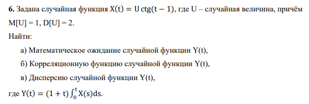 Задана случайная функция X(t) = U ctg(t − 1), где U – случайная величина, причём M[U] = 1, D[U] = 2. Найти: а) Математическое ожидание случайной функции Y(t), б) Корреляционную функцию случайной функции Y(t), в) Дисперсию случайной функции Y(t), где Y(t) = (1 + t) ∫ X(s)ds t 0 .