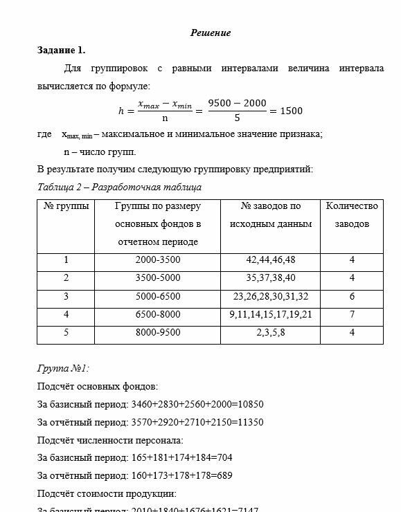 Произвести сводку и группировку исходной информации, выделив 5 групп заводов по размеру основных фондов в отчетном периоде. По каждой группе рассчитать: