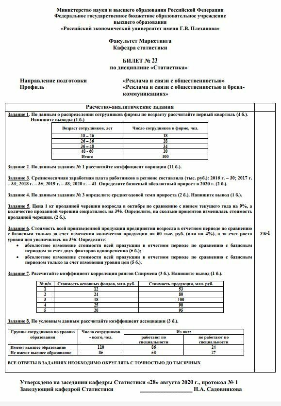 Для студентов РЭУ им. Плеханова по предмету Теория статистикиЭкзаменационные билетыЭкзаменационные билеты 2021-06-26СтудИзба