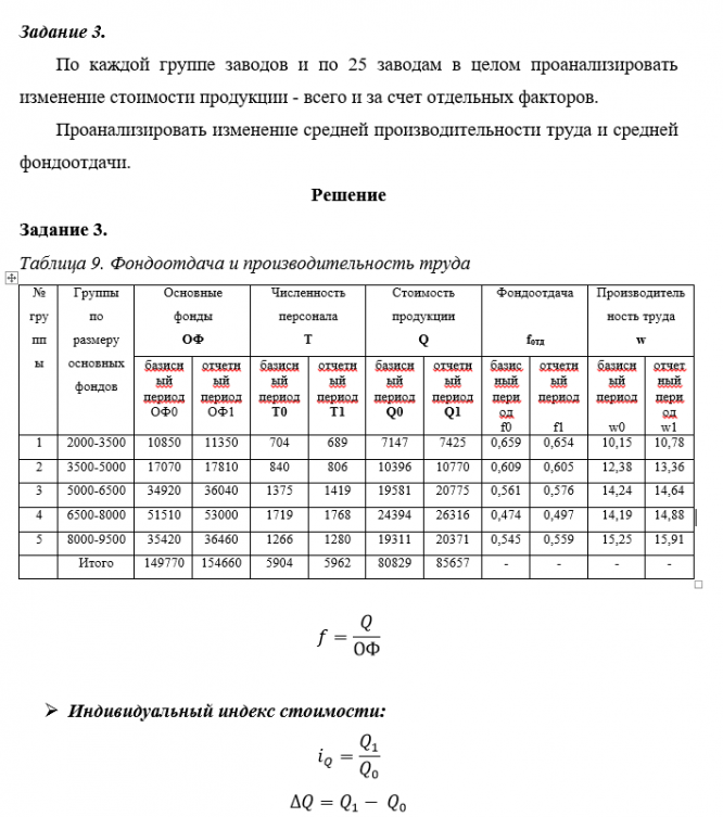 Главная » Учебные материалы » Теория статистики » Решения задач » Несколько классов/семестров » Задание 3. По каждой группе заводов и по 25 заводам в целом проанализировать изменение стоимости продукции - всего и за счет отдельных факторов. Проанализировать изменение средней производительности труда и средней фондоотдачи.
