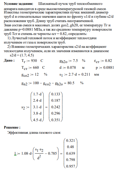 Условие задания: Шахматный пучок труб теплообменного аппарата находится в среде высокотемпературоной газовой смеси. Известны геометрические характеристики пучка: внешний диаметр труб d и относительные значения шагов по фронту s1/d и глубине s2/d расположения труб. Длину труб считать неограниченной. Зная состав смеси в массовых долях gco2, gh20, ее температуру Тг и давление р=0.0881 МПа, а так же среднюю температуру поверхности труб Тст и степень ее черноты εст = 0.82, определить: 1) Лучистый тепловой поток и коэффициент теплоотдачи излучением от газа к поверхности труб. 2) Влияние геометрических характеристик s2/d на коэффициент теплоотдачи излучением, если их значения изменяются в диапазоне s2/d = (1.7; 4.5)