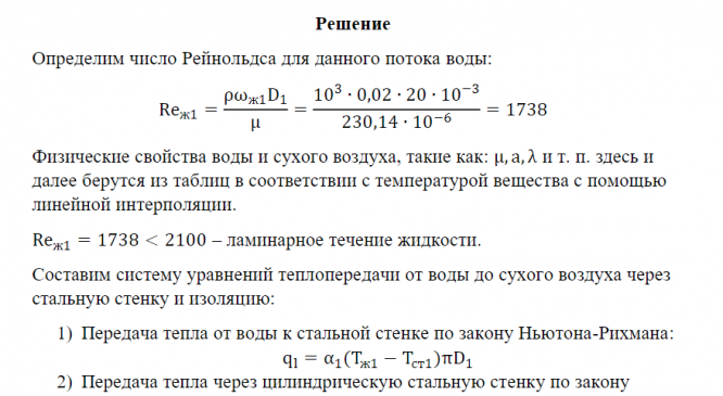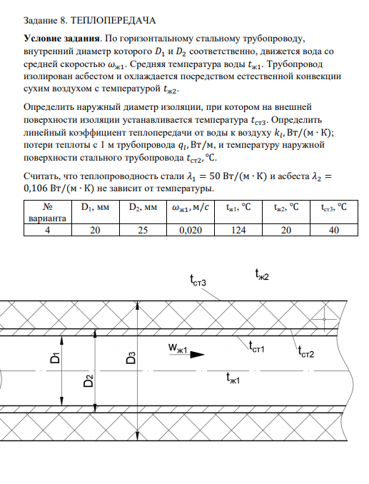 Условие задания. По горизонтальному стальному трубопроводу, внутренний диаметр которого D1 и D2 соответственно, движется вода со средней скоростью Средняя температура воды . Трубопровод изолирован асбестом и охлаждается посредством естественной конвекции сухим воздухом с температурой. Определить наружный диаметр изоляции, при котором на внешней поверхности изоляции устанавливается температура . Определить линейный коэффициент теплопередачи от воды к воздуху , Вт/(м ∙ К); потери теплоты с 1 м трубопровода , Вт/м, и температуру наружной поверхности стального трубопровода ℃. Считать, что теплопроводность стали = 50 Вт/(м ∙ К) и асбеста = 0,106 Вт/(м ∙ К) не зависит от температуры.