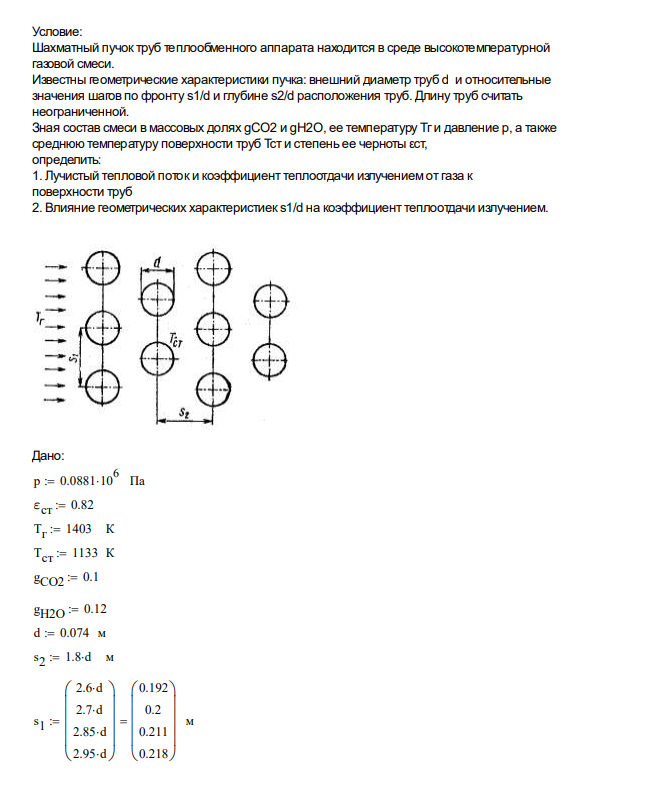 Шахматный пучок труб теплообменного аппарата находится в среде высокотемпературной газовой смеси. Известны геометрические характеристики пучка: внешний диаметр труб d и относительные значения шагов по фронту s1/d и глубине s2/d расположения труб. Длину труб считать неограниченной. Зная состав смеси в массовых долях gCO2 и gH2O, ее температуру Тг и давление р, а также среднюю температуру поверхности труб Тст и степень ее черноты εст, определить: 1. Лучистый тепловой поток и коэффициент теплоотдачи излучением от газа к поверхности труб 2. Влияние геометрических характеристиек s1/d на коэффициент теплоотдачи излучением