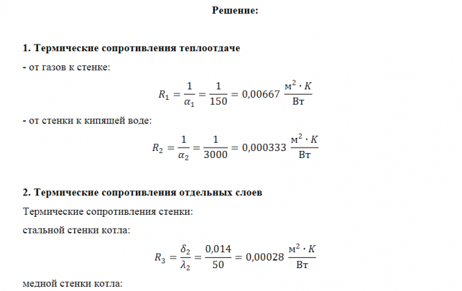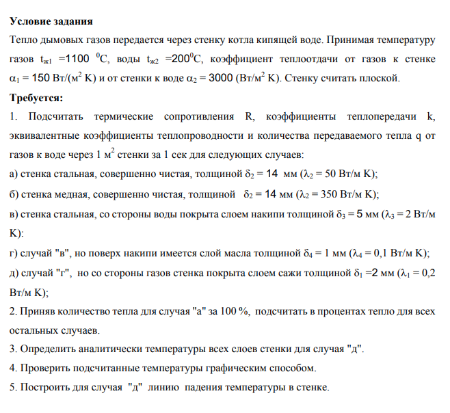 Условие задания Тепло дымовых газов передается через стенку котла кипящей воде. Принимая температуру газов tж1 =1100 0 C, воды tж2 =2000 C, коэффициент теплоотдачи от газов к стенке a1 = 150 Вт/(м 2 K) и от стенки к воде a2 = 3000 (Вт/м 2 K). Стенку считать плоской. Требуется: 1. Подсчитать термические сопротивления R, коэффициенты теплопередачи k, эквивалентные коэффициенты теплопроводности и количества передаваемого тепла q от газов к воде через 1 м 2 стенки за 1 сек для следующих случаев: а) стенка стальная, совершенно чистая, толщиной d2 = 14 мм (l2 = 50 Вт/м K); б) стенка медная, совершенно чистая, толщиной d2 = 14 мм (l2 = 350 Вт/м K); в) стенка стальная, со стороны воды покрыта слоем накипи толщиной d3 = 5 мм (l3 = 2 Вт/м K): г) случай "в", но поверх накипи имеется слой масла толщиной d4 = 1 мм (l4 = 0,1 Вт/м K); д) случай "г", но со стороны газов стенка покрыта слоем сажи толщиной d1 =2 мм (l1 = 0,2 Вт/м K); 2. Приняв количество тепла для случая "а" за 100 %, подсчитать в процентах тепло для всех остальных случаев. 3. Определить аналитически температуры всех слоев стенки для случая "д". 4. Проверить подсчитанные температуры графическим способом. 5. Построить для случая "д" линию падения температуры в стенке.
