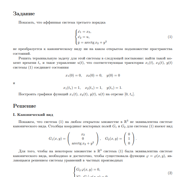 Показать, что аффинная система третьего порядка не преобразуется к каноническому виду ни на каком открытом подмножестве пространства состояний. Решить терминальную задачу для этой системы в следующей постановке: найти такой момент времени t∗ и такое управление u(t), что соответствующая траектория x1(t), x2(t), y(t) системы (1) соединяет состояния