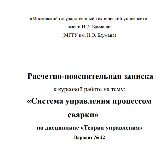 Для студентов МГТУ им. Н.Э.Баумана по предмету Теория управленияКурсовой проект на тему Система управления процессом сварки (Вариант 22)Курсовой проект на тему Система управления процессом сварки (Вариант 22)