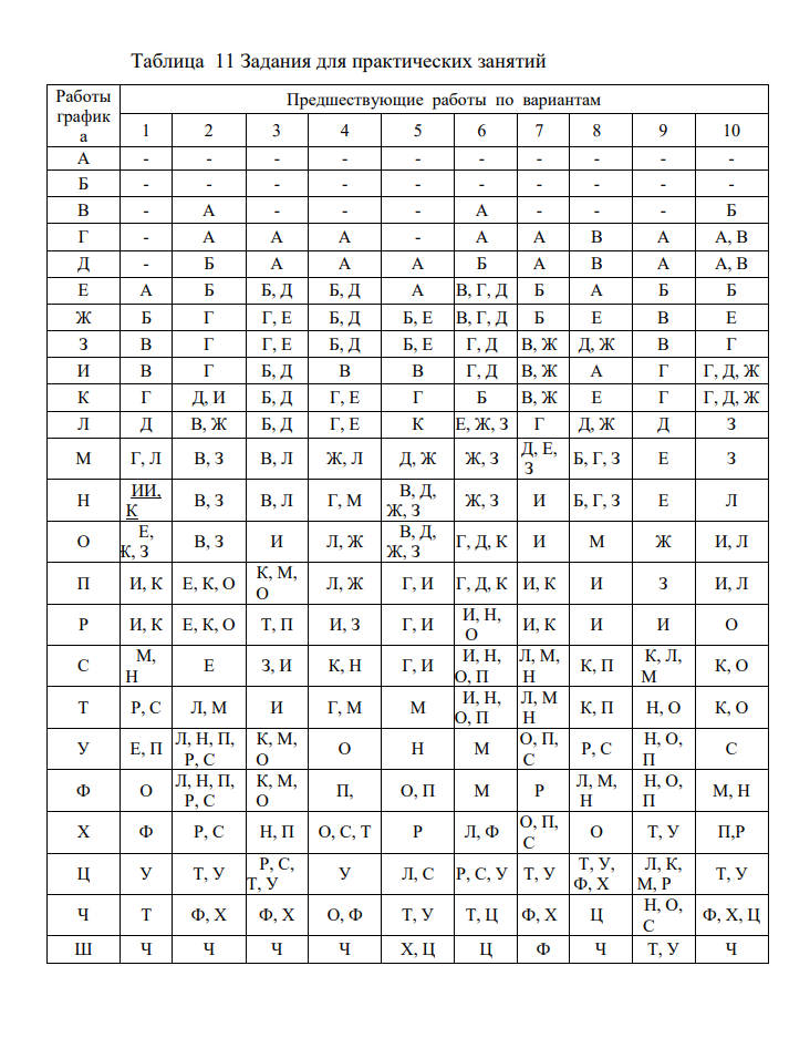 Задания для практических занятий. Построить график (вершинный и сетевой) на основе следующей информации.