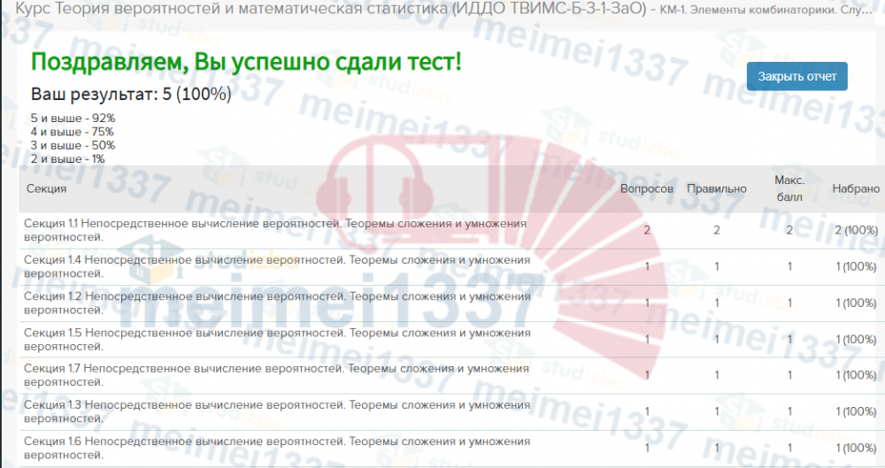 Курс Теория вероятностей и математическая статистика - КМ-1. Элементы комбинаторики. Случайные события. Тестирование - 100%