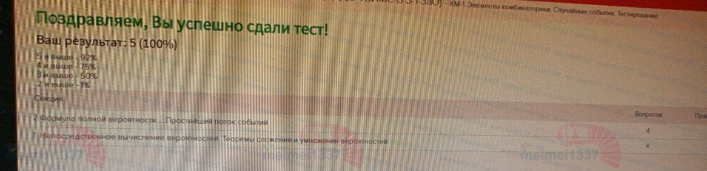 Курс Теория вероятностей и математическая статистика - КМ-1. Элементы комбинаторики. Случайные события. Тестирование - 100%