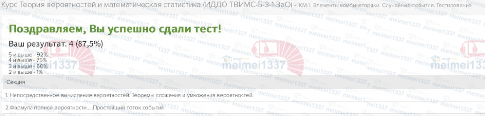 Курс Теория вероятностей и математическая статистика - КМ-1. Элементы комбинаторики. Случайные события. Тестирование - 87.5%