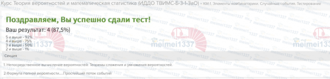 Для студентов ИДДО НИУ «МЭИ» по предмету Теория вероятностей и математическая статистика (ТВиМС)КМ-1. Элементы комбинаторики. Случайные события. Тестирование - 87.5%КМ-1. Элементы комбинаторики. Случайные события. Тестирование - 87.5%