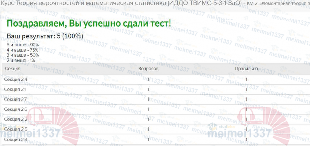 Курс Теория вероятностей и математическая статистика - КМ-2. Элементарная теория вероятностей. Тестирование - 100%