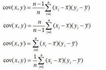 Ковариация между выборками x=(x1,x2,...,xn) и y=(y1,y2,...,yn) вычисляется по формуле: