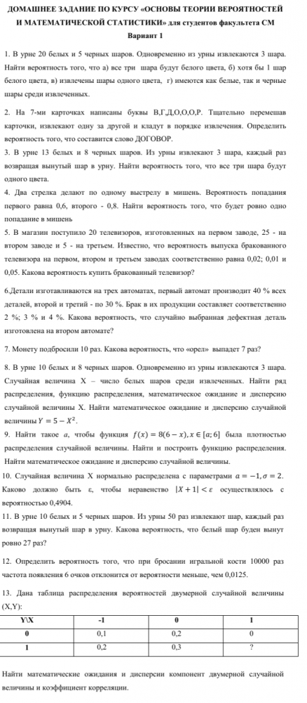 ДЗ 1: Тервер ДЗ (часть 1 - задачи 1-7, 11, 12) вариант 1