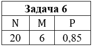 • Задача 6. В отдел технического контроля поступает партия, содержащая N изделий, среди которых имеется M бракованных. Контролер для контроля отбирает 3 изделия, при этом в бракованном изделии он обнаруживает брак с вероятностью P. Партия бракуется, если среди трех отобранных для проверки изделий обнаружено хотя бы одно бракованное изделие. Найти вероятность того, что данная партия изделий будут забракована.