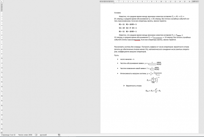 4. Рассмотреть систему без ограничений на длину очереди, учитывающей фактор ухода клиентов из очереди (среднее приемлемое время ожидания – Tw = R3+G3+B3=7 секунд). Построить графики от числа операторов (вплоть до числа каналов, соответствующего 1% отказов в системе без очереди): математического ожидания числа занятых операторов; коэффициента загрузки операторов; вероятности существования очереди; математического ожидания длины очереди. 15