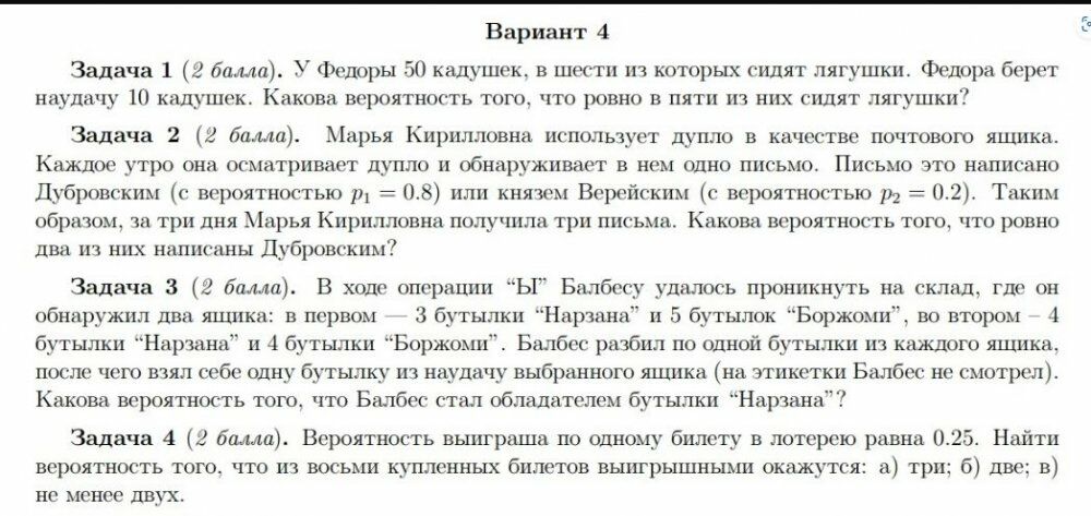 Вариант 4 - ДЗ №1 - Теория вероятностей - Часть 1 «случайные события» - 4 задач