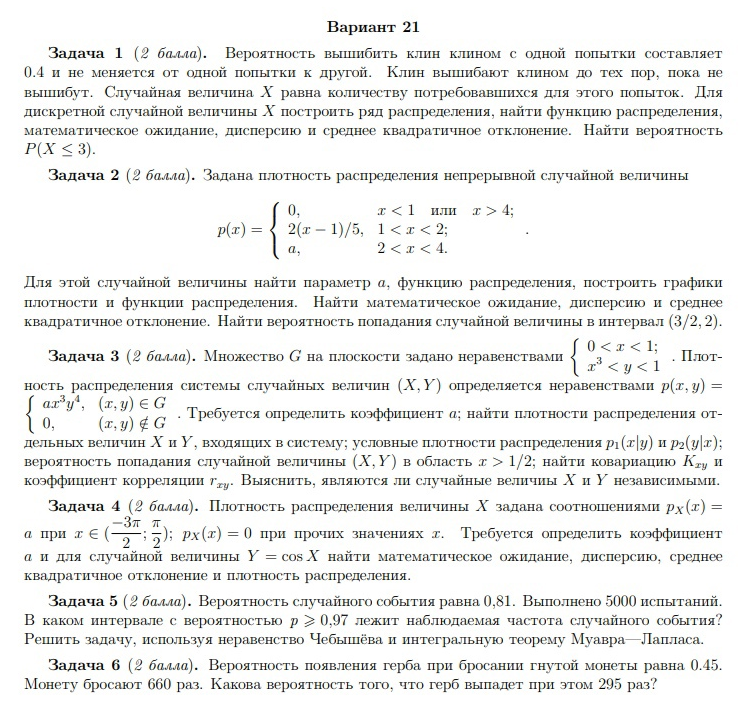 Для студентов МГТУ им. Н.Э.Баумана по предмету Теория вероятностей и математическая статистикаВариант 21 - "теория вероятностей" - 6 задачВариант 21 - "теория вероятностей" - 6 задач