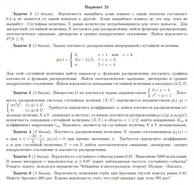 Для студентов МГТУ им. Н.Э.Баумана по предмету Теория вероятностей и математическая статистика (ТВиМС)Вариант 21 - "теория вероятностей" - 6 задачВариант 21 - "теория вероятностей" - 6 задач
