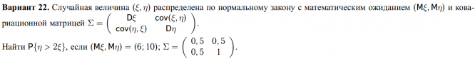 ЗАДАЧА 1: Случайная величина (ξ, η) распределена по нормальному закону с математическим ожиданием (Mξ, Mη) и ковариационной матрицей. ЗАДАЧА 2: Вероятность случайного события равна 0,67. Сколько нужно провести испытаний, чтобы с вероятностью, не менее, чем 0,98, можно было ожидать, что наблюдаемая частота случайного события отклонится от его вероятности не более чем на 0,01? Решить задачу двумя способами: используя неравенство Чебышёва и интегральную теорему Муавра — Лапласа. ЗАДАЧА 3: Для заданной выборки: 1) постройте: а) статистический ряд; б) интервальный статистический ряд, предварительно определив число интервалов; 2) найдите значения точечных оценок математического ожидания и дисперсии; 3) постройте гистограмму; 4) на основе анализа результатов наблюдений выдвинете гипотезу о виде закона распределения генеральной совокупности.