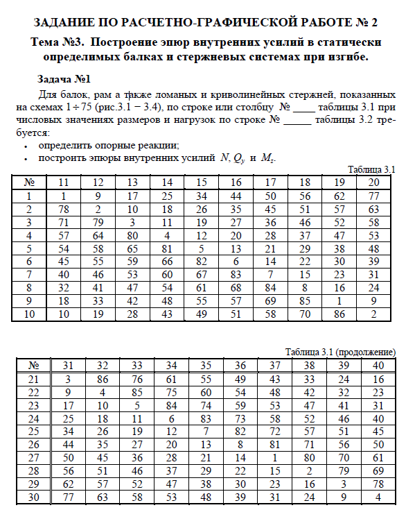 28 ЗАДАНИЕ ПО РАСЧЕТНО-ГРАФИЧЕСКОЙ РАБОТЕ № 2 Тема №3. Построение эпюр внутренних усилий в статически определимых балках и стержневых системах при изгибе. Задача №1 Для балок, рам а также ломаных и криволинейных стержней, показанных на схемах 1  75 (рис.3.1 − 3.4), по строке или столбцу № ____ таблицы 3.1 при числовых значениях размеров и нагрузок по строке № _____ таблицы 3.2 тре- буется:  определить опорные реакции;  построить эпюры внутренних усилий N, Qy и Mz. Таблица 3.1 № 11 12 13 14 15 16 17 18 19 20 1 1 9 17 25 34 44 50 56 62 77 2 78 2 10 18 26 35 45 51 57 63 3 71 79 3 11 19 27 36 46 52 58 4 57 64 80 4 12 20 28 37 47 53 5 54 58 65 81 5 13 21 29 38 48 6 45 55 59 66 82 6 14 22 30 39 7 40 46 53 60 67 83 7 15 23 31 8 32 41 47 54 61 68 84 8 16 24 9 18 33 42 48 55 57 69 85 1 9 10 10 19 28 43 49 51 58 70 86 2 Таблица 3.1 (продолжение) № 31 32 33 34 35 36 37 38 39 40 21 3 86 76 61 55 49 43 33 24 16 22 9 4 85 75 60 54 48 42 32 23 23 17 10 5 84 74 59 53 47 41 31 24 25 18 11 6 83 73 58 52 46 40 25 34 26 19 12 7 82 72 57 51 45 26 44 35 27 20 13 8 81 71 56 50 27 50 45 36 28 21 14 1 80 70 61 28 56 51 46 37 29 22 15 2 79 69 29 62 57 52 47 38 30 23 16 3 78 30 77 63 58 53 48 39 31 24 9 4 29 1 q1 M P2 c a q1 M P1 c a b 2 P1 M 2c b q3 2 a b M qP 1 2 4 b a q2 P1 M b 6 M 5 P 2M 2 c a b q1 M P1 с c 7 8 P1 qM 1 c b 9 q1 P1 a b c M P M 1 q10 2 a b P M 2 11 q1 a c c P M 2 P1 c b c P1 M a 12 13 b c 14 q1 M a 2b 15 q2 2a b 16 c a P1 q2 M c 19 q1 2a c 18 qM 2 c 2b q2 17 2a c P1 q1 21 c q1 c 20 q2 2b P2 M 2b 22 2a c q2 23 c b q2 24 c a q2 q1 P1 P1 M M M Рис.