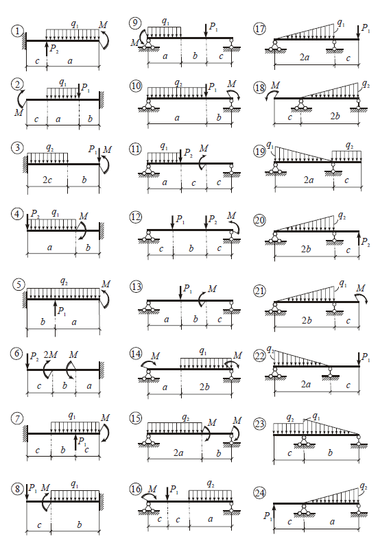 3.3 32 P2 q1 2b 62 q1 P1 b b 2a 2a a a 2b q1 2P2 64 P2 66 q1 P1 b b 2a a a b b P2 P2 q1 67 68 69 2b 2a a a a b b 2P2 70 71 72 P1 b a 2a b b q1 b b q2 a M q2 c c c P1 b b 2P2 a c M c q1 M b a a c b 2P1 q2 c b P1 c 63 65 73 P 76 74 2 75 P1 b M a M q1 b q2 2a 2с b a b 2b q1 P2 a P1 M q2 P1 P1 Рис. 3.4 33 Задача №2 (Факультативно) Для балок, показанных на схемах 77  86 (рис 3.5), по известным эпюрам изгибающих моментов Мz требуется:  определить действующую на балку нагрузку (сосредоточенные силы и мо- менты, равномерно распределѐнная нагрузка) и опорные реакции;  построить эпюру поперечных сил Qy. 2 м 1м 1м 2 м (кНм) M Mmax= 40 Mmax= 40 80 80 50 40 20 20 2 м 1м 1м 20 50 45 5 Mmax= 45 50 2 м 2 м 44 32 49 80 70 2 м 2 м 2 м 1,5 м Mmax= 22,5 40 40 40 30 60 1м 2 м 2 м 1м 20 30 40 77 78 79 80 81 82 83 84 85 86 (кНм) M (кНм) M (кНм) M (кНм) M (кНм) M (кНм) M (кНм) M (кНм) M (кНм) _ M + _ + _ + _ + _ + _ + + + _ + излом Рис.