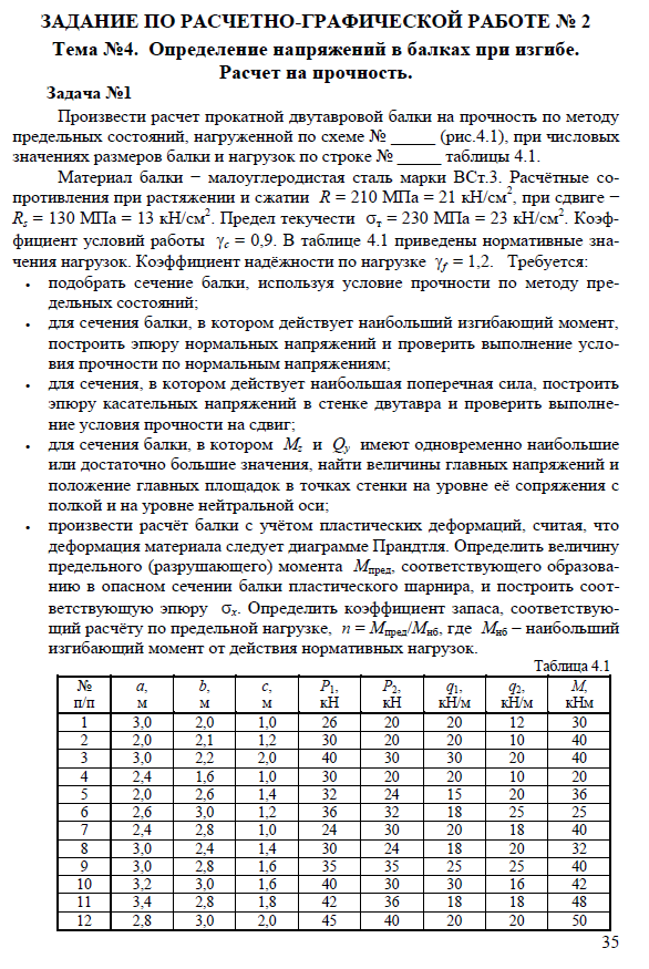 35 ЗАДАНИЕ ПО РАСЧЕТНО-ГРАФИЧЕСКОЙ РАБОТЕ № 2 Тема №4. Определение напряжений в балках при изгибе. Расчет на прочность. Задача №1 Произвести расчет прокатной двутавровой балки на прочность по методу предельных состояний, нагруженной по схеме № _____ (рис.4.1), при числовых значениях размеров балки и нагрузок по строке № _____ таблицы 4.1. Материал балки − малоуглеродистая сталь марки ВСт.3. Расчётные со-противления при растяжении и сжатии R = 210 МПа = 21 кН/см2, при сдвиге − Rs = 130 МПа = 13 кН/см2. Предел текучести т = 230 МПа = 23 кН/см2. Коэф-фициент условий работы с = 0,9. В таблице 4.1 приведены нормативные зна-чения нагрузок. Коэффициент надёжности по нагрузке f = 1,2.