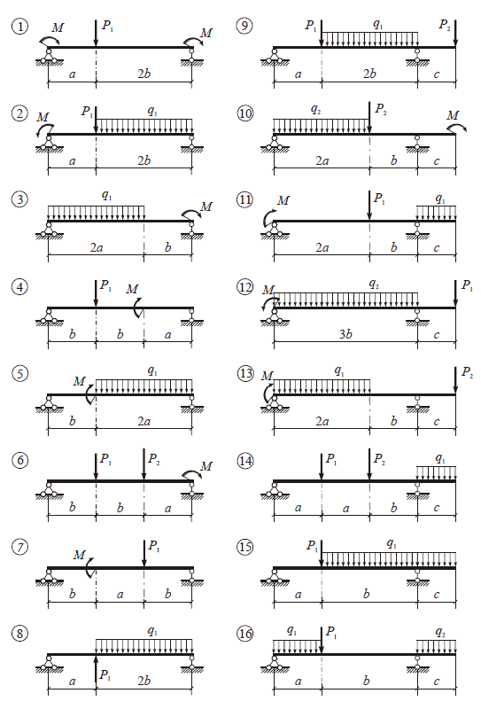 4.1 (Схемы балок для задачи № 1) 39 M M 25 26 27 28 29 30 31 32 17 18 19 20 21 22 23 24 P1 P1 P1 P2 P1 P1 P1 P2 P1 P1 P2 P1 P1 P1 P1 P2 2b a b a a c c 2a a b b b b b b b b b b a b b b a a a b c c c c c c c c c c c c c c c c c 2a a a a a a a 2a M M M M M M q1 q1 P2 P2 P2 q1 q1 q1 q2 q1 q1 q1 q2 q1 q2 Рис. 4.1 (Продолжение) 40 q q P a b 1 1 2 2 3 3 4 4 6 6 5 5 7 7 8 8 a b 4P М P b b P a a 3P P 2b P b P b М М 2b a a 2b a a М 2М 3q 2b 2b М q М a a 2М a a a a a/2 a М 3М q a/2 P 4P Рис. 4.2 (Схемы балок для задачи № 2) Рис. 4.3 (Схемы балок для задачи № 3) 41 0,5b 1 3 5 7 2 4 6 8 b Рис. 4.4 (Сечения балок для задачи № 2) 42 1 3 5 7 2 4 6 8 6см 3см 6см 2см 4см 2см 4см 6см 2см 2см 6см 9см 2см 3см 6см 6см 3см 6см 3см 6см 3см 3см 9см 3см 3см 3см 6см 3см 6см 3см 2см 3см 2см 2см 6см 6см 3см 4см Рис.