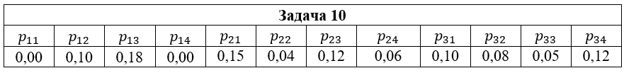 • Задача 10. Дана система двух дискретных случайных величин (ξ,η), закон распределения которой задан таблицей pij = P (ξ=xi, η=yj); i=1,2,3; j=1,2,3,4, где x1=2; x2=3; x3=5; y1=-1; y2=0; y3=1; y4=2. Найти: 1) законы распределения случайных величин ξ и η; 2) математические ожидания и дисперсии случайных величин ξ и η; 3) коэффициент корреляции rξη; 4) условные распределения Pξ(xi|y2); Pη(yi|x2); 5) условные математические ожидания M(ξ|y2); M(η|x2).
