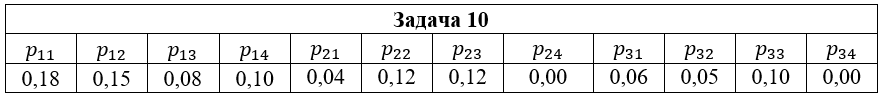 • Задача 10. Дана система двух дискретных случайных величин (ξ,η), закон распределения которой задан таблицей pij = P (ξ=xi, η=yj); i=1,2,3; j=1,2,3,4, где x1=2; x2=3; x3=5; y1=-1; y2=0; y3=1; y4=2. Найти: 1) законы распределения случайных величин ξ и η; 2) математические ожидания и дисперсии случайных величин ξ и η; 3) коэффициент корреляции rξη; 4) условные распределения Pξ(xi|y2); Pη(yi|x2); 5) условные математические ожидания M(ξ|y2); M(η|x2).