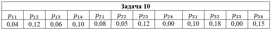• Задача 10. Дана система двух дискретных случайных величин (ξ,η), закон распределения которой задан таблицей pij = P (ξ=xi, η=yj); i=1,2,3; j=1,2,3,4, где x1=2; x2=3; x3=5; y1=-1; y2=0; y3=1; y4=2. Найти: 1) законы распределения случайных величин ξ и η; 2) математические ожидания и дисперсии случайных величин ξ и η; 3) коэффициент корреляции rξη; 4) условные распределения Pξ(xi|y2); Pη(yi|x2); 5) условные математические ожидания M(ξ|y2); M(η|x2).