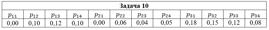• Задача 10. Дана система двух дискретных случайных величин (ξ,η), закон распределения которой задан таблицей pij = P (ξ=xi, η=yj); i=1,2,3; j=1,2,3,4, где x1=2; x2=3; x3=5; y1=-1; y2=0; y3=1; y4=2. Найти: 1) законы распределения случайных величин ξ и η; 2) математические ожидания и дисперсии случайных величин ξ и η; 3) коэффициент корреляции rξη; 4) условные распределения Pξ(xi|y2); Pη(yi|x2); 5) условные математические ожидания M(ξ|y2); M(η|x2).