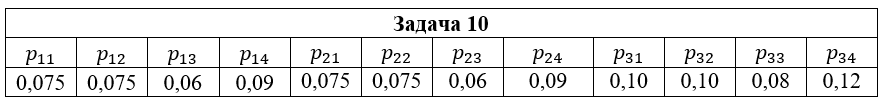 • Задача 10. Дана система двух дискретных случайных величин (ξ,η), закон распределения которой задан таблицей pij = P (ξ=xi, η=yj); i=1,2,3; j=1,2,3,4, где x1=2; x2=3; x3=5; y1=-1; y2=0; y3=1; y4=2. Найти: 1) законы распределения случайных величин ξ и η; 2) математические ожидания и дисперсии случайных величин ξ и η; 3) коэффициент корреляции rξη; 4) условные распределения Pξ(xi|y2); Pη(yi|x2); 5) условные математические ожидания M(ξ|y2); M(η|x2).