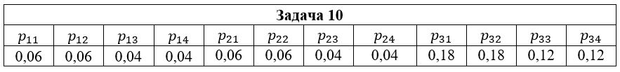 • Задача 10. Дана система двух дискретных случайных величин (ξ,η), закон распределения которой задан таблицей pij = P (ξ=xi, η=yj); i=1,2,3; j=1,2,3,4, где x1=2; x2=3; x3=5; y1=-1; y2=0; y3=1; y4=2. Найти: 1) законы распределения случайных величин ξ и η; 2) математические ожидания и дисперсии случайных величин ξ и η; 3) коэффициент корреляции rξη; 4) условные распределения Pξ(xi|y2); Pη(yi|x2); 5) условные математические ожидания M(ξ|y2); M(η|x2).