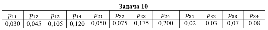 • Задача 10. Дана система двух дискретных случайных величин (ξ,η), закон распределения которой задан таблицей pij = P (ξ=xi, η=yj); i=1,2,3; j=1,2,3,4, где x1=2; x2=3; x3=5; y1=-1; y2=0; y3=1; y4=2. Найти: 1) законы распределения случайных величин ξ и η; 2) математические ожидания и дисперсии случайных величин ξ и η; 3) коэффициент корреляции rξη; 4) условные распределения Pξ(xi|y2); Pη(yi|x2); 5) условные математические ожидания M(ξ|y2); M(η|x2).
