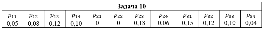 • Задача 10. Дана система двух дискретных случайных величин (ξ,η), закон распределения которой задан таблицей pij = P (ξ=xi, η=yj); i=1,2,3; j=1,2,3,4, где x1=2; x2=3; x3=5; y1=-1; y2=0; y3=1; y4=2. Найти: 1) законы распределения случайных величин ξ и η; 2) математические ожидания и дисперсии случайных величин ξ и η; 3) коэффициент корреляции rξη; 4) условные распределения Pξ(xi|y2); Pη(yi|x2); 5) условные математические ожидания M(ξ|y2); M(η|x2).