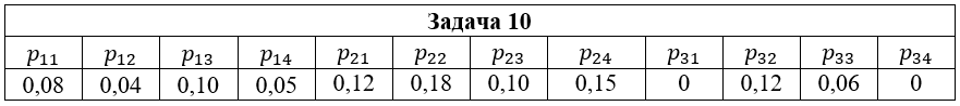 • Задача 10. Дана система двух дискретных случайных величин (ξ,η), закон распределения которой задан таблицей pij = P (ξ=xi, η=yj); i=1,2,3; j=1,2,3,4, где x1=2; x2=3; x3=5; y1=-1; y2=0; y3=1; y4=2. Найти: 1) законы распределения случайных величин ξ и η; 2) математические ожидания и дисперсии случайных величин ξ и η; 3) коэффициент корреляции rξη; 4) условные распределения Pξ(xi|y2); Pη(yi|x2); 5) условные математические ожидания M(ξ|y2); M(η|x2).