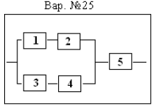 • Задача 3. Задана структурная схема надежности системы, состоящей из пяти элементов. Событие Аi - отказ i-го элемента за некоторый промежуток времени. Вероятности безотказной работы элементов заданы: P(Ai)=0,95; i=1,3,5; P(Aj)=0,95; j=2,4. Событие А состоит в безотказной работе всей системы за рассматриваемый промежуток времени (события Аi независимы в совокупности). Требуется: 1) выразить событие А через Ai или Аi (i=1,2,3,4,5); 2) найти вероятность P(A) безотказной работы системы.