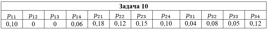 • Задача 10. Дана система двух дискретных случайных величин (ξ,η), закон распределения которой задан таблицей pij = P (ξ=xi, η=yj); i=1,2,3; j=1,2,3,4, где x1=2; x2=3; x3=5; y1=-1; y2=0; y3=1; y4=2. Найти: 1) законы распределения случайных величин ξ и η; 2) математические ожидания и дисперсии случайных величин ξ и η; 3) коэффициент корреляции rξη; 4) условные распределения Pξ(xi|y2); Pη(yi|x2); 5) условные математические ожидания M(ξ|y2); M(η|x2).