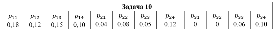 • Задача 10. Дана система двух дискретных случайных величин (ξ,η), закон распределения которой задан таблицей pij = P (ξ=xi, η=yj); i=1,2,3; j=1,2,3,4, где x1=2; x2=3; x3=5; y1=-1; y2=0; y3=1; y4=2. Найти: 1) законы распределения случайных величин ξ и η; 2) математические ожидания и дисперсии случайных величин ξ и η; 3) коэффициент корреляции rξη; 4) условные распределения Pξ(xi|y2); Pη(yi|x2); 5) условные математические ожидания M(ξ|y2); M(η|x2).