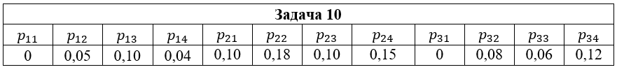 • Задача 10. Дана система двух дискретных случайных величин (ξ,η), закон распределения которой задан таблицей pij = P (ξ=xi, η=yj); i=1,2,3; j=1,2,3,4, где x1=2; x2=3; x3=5; y1=-1; y2=0; y3=1; y4=2. Найти: 1) законы распределения случайных величин ξ и η; 2) математические ожидания и дисперсии случайных величин ξ и η; 3) коэффициент корреляции rξη; 4) условные распределения Pξ(xi|y2); Pη(yi|x2); 5) условные математические ожидания M(ξ|y2); M(η|x2).