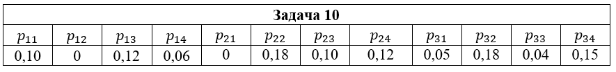 • Задача 10. Дана система двух дискретных случайных величин (ξ,η), закон распределения которой задан таблицей pij = P (ξ=xi, η=yj); i=1,2,3; j=1,2,3,4, где x1=2; x2=3; x3=5; y1=-1; y2=0; y3=1; y4=2. Найти: 1) законы распределения случайных величин ξ и η; 2) математические ожидания и дисперсии случайных величин ξ и η; 3) коэффициент корреляции rξη; 4) условные распределения Pξ(xi|y2); Pη(yi|x2); 5) условные математические ожидания M(ξ|y2); M(η|x2).
