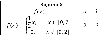 • Задача 8. Дана плотность вероятности f(x) случайной величины ξ. Случайная величина η связана со случайной величиной ξ функциональной зависимостью η=aξ2+b. Найти: 1) математическое ожидание и дисперсию случайной величины η, используя плотность вероятности случайной величины ξ; 2) плотность вероятности случайной величины η и построить ее графики; 3) математическое ожидание и дисперсию случайной величины η, используя найденную плотность вероятности случайной величины η.